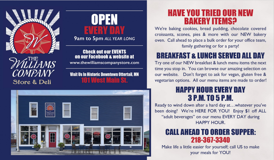 The Williams Company Store & Deli is located in historic downtown Ottertail, MN. Vacationers and local community members are drawn to our historic building and find themselves returning to the store with friends & family year after year! Our outdoor seating area is the perfect place to enjoy breakfast or lunch with a fresh espresso drink, smoothie, beer or wine during our summer months! Don’t forget the ice cream too!
